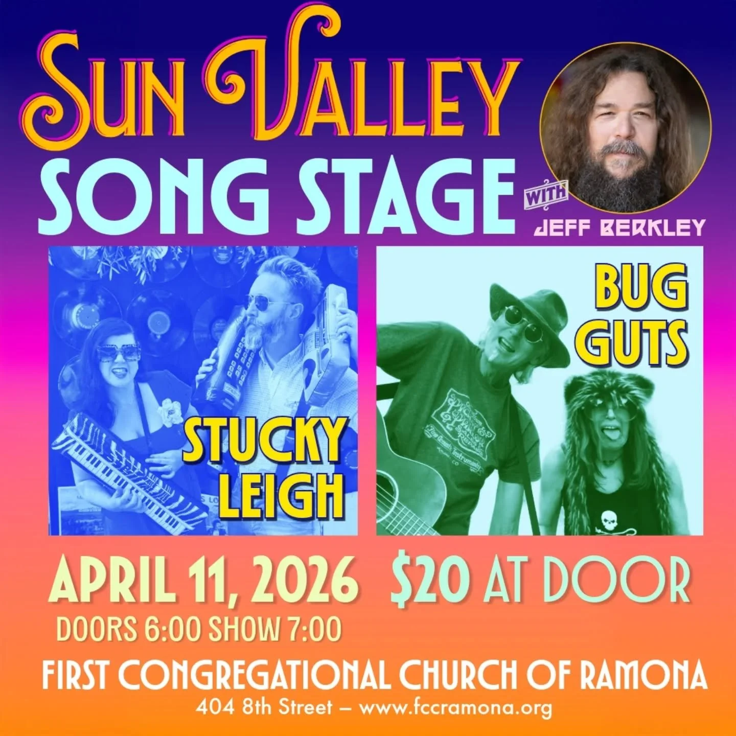 Join us on Saturday evening, April 11th, 2026, as our sanctuary becomes an intimate venue where stories are sung, artistry is celebrated, and the community gathers around great music. This special event features performances by Bug Guts and Stucky Leigh, two compelling acts known for their originality, depth, and powerful connection with audiences.